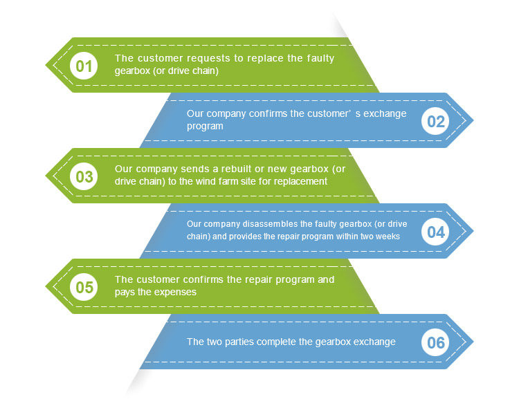 At this point, the newly installed gearbox (or drive chain) will be owned by the customers, while the ownership of the dismounted one will be transferred to our company. Meanwhile, the wind turbine resumes operation in short order.